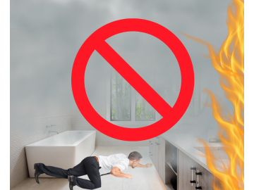 一般人遇到火災時一定都會慌張、不知所措,尤其當遇到出入口通道被堵住無法直接逃離起火建築時,第一直覺就會衝到浴室。常見的錯誤認知有:1. 認為浴室有充足水源,可以用來滅火、沖濕身體、用濕毛巾堵門縫。2. 聽說浴室地板排水孔裡面有殘存空氣,鼻子可貼近吸取新鮮空氣。3. 浴室內是不燃的磁磚材質,應該比較安全吧?